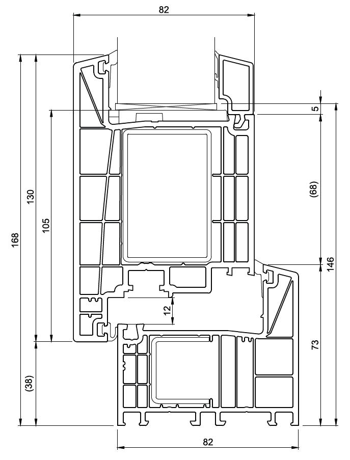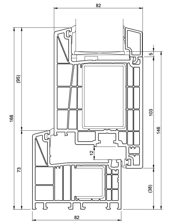 De diepte van dit profiel is 82 mm en is voorzien van twee rubberen afdichtingen t.b.v. de isolatie.